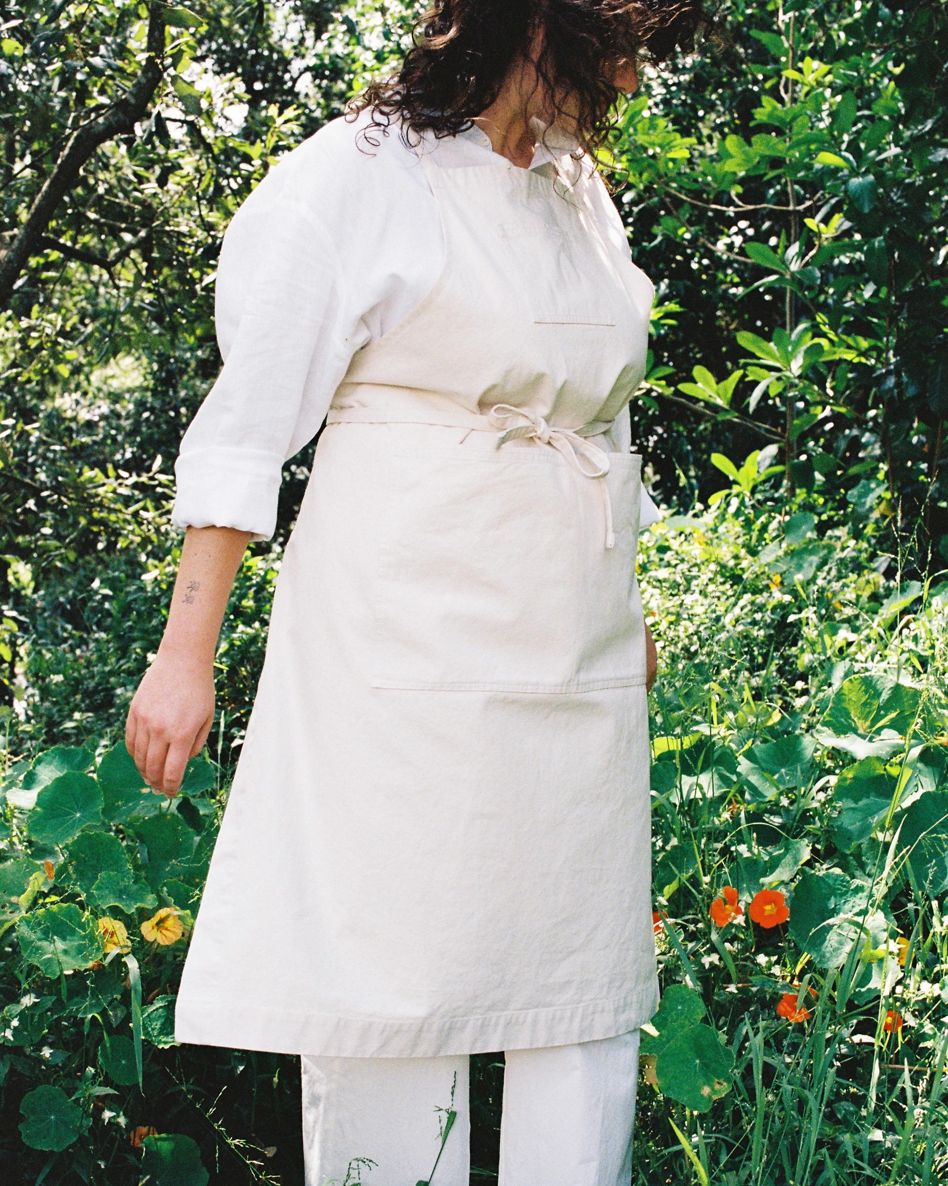 We have two apron options: the Creamy Natural 100% Cotton Canvas, or the Indigo Blue which is a Linen/ Cotton Blend from Japan. The canvas is a thicker option than the linen blend, it has a bit more structure and has a lovely natural matte finish with husks speckled through it. I have one at home I have been using for a couple of years and it has worn well, and the stains wash out pretty well! I have a few on rotation. I use them everyday.