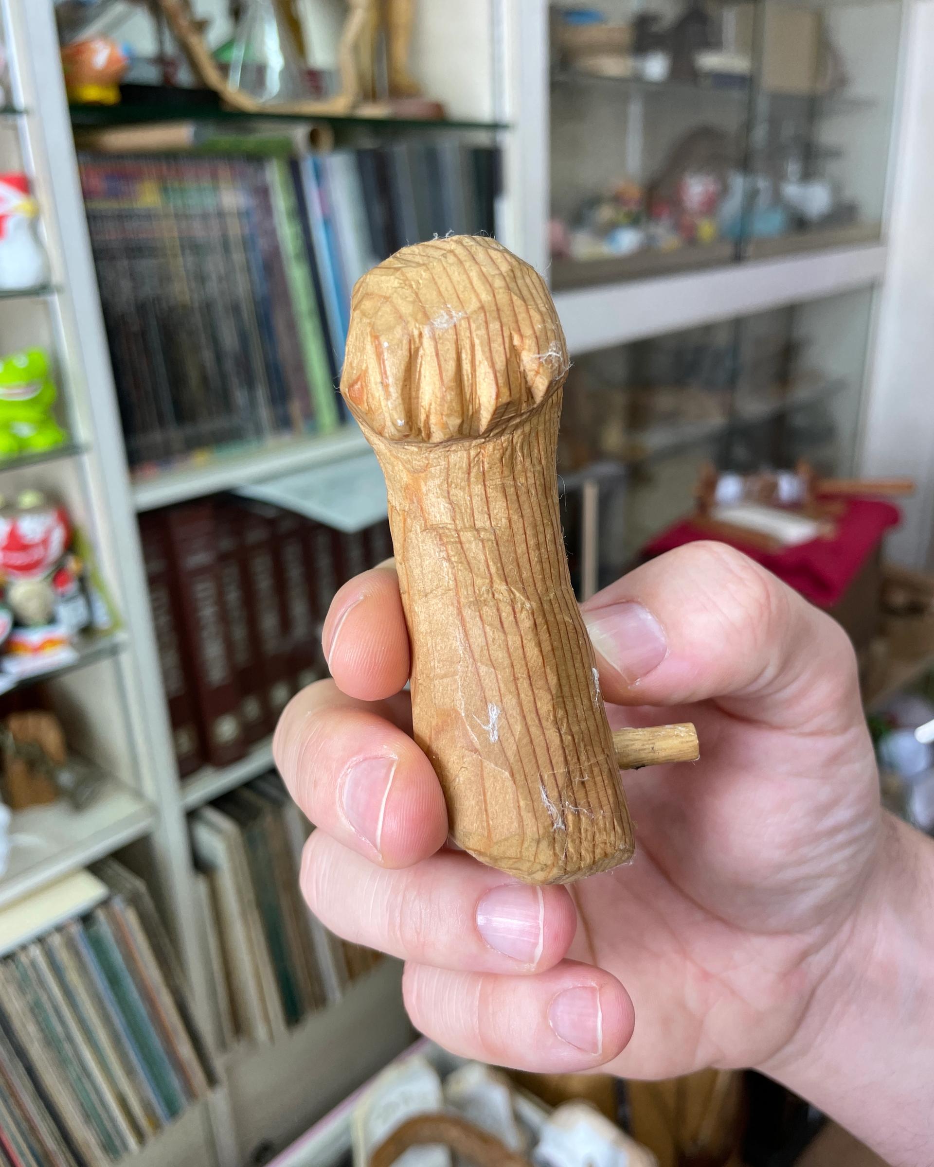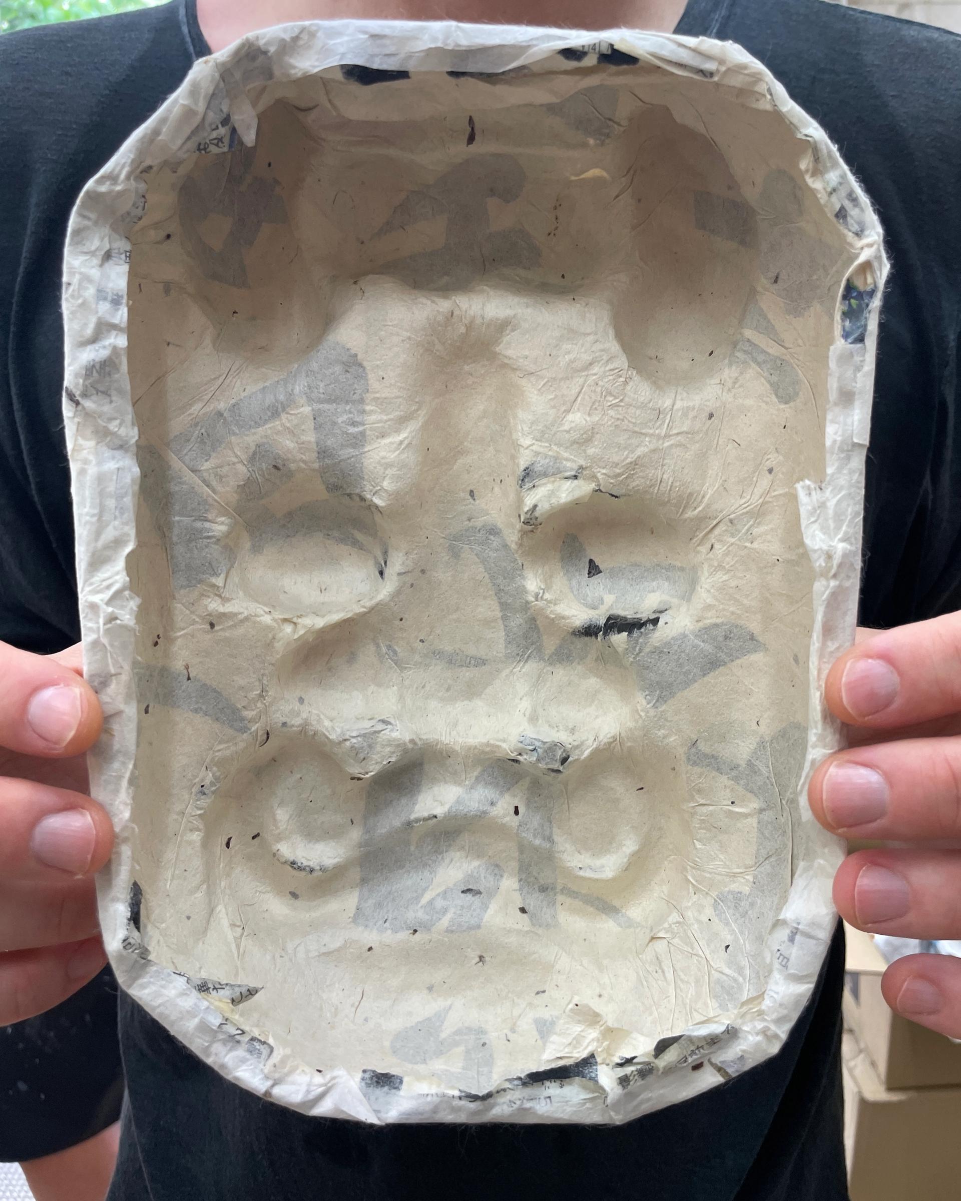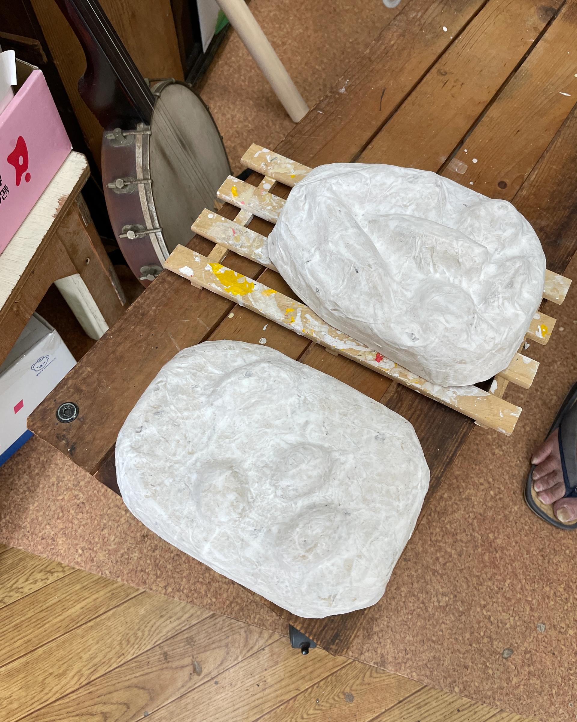 A mould for one of the masks. We loved seeing these. All the holes where eyes, noses and mouths can be placed depending on which face he is making.