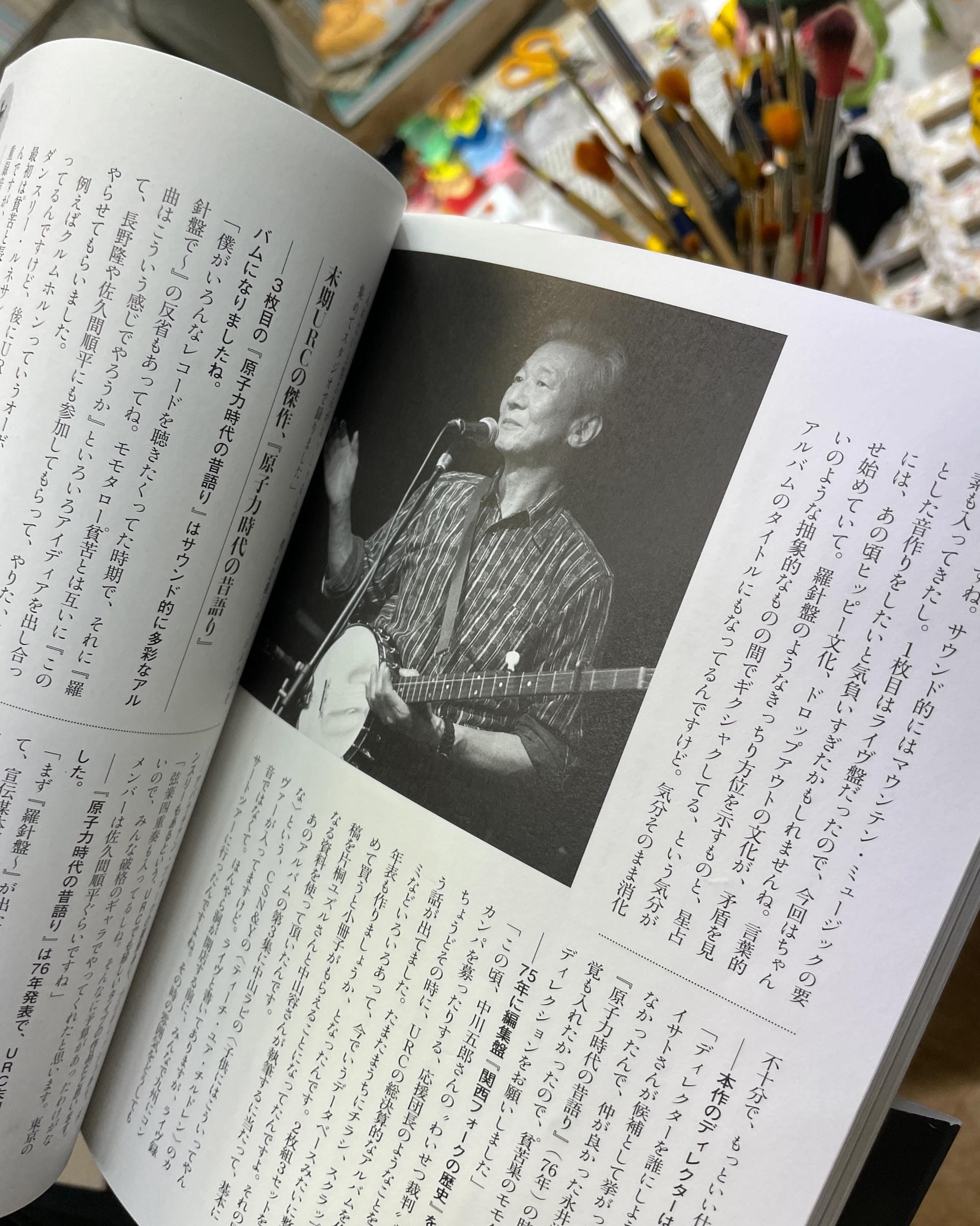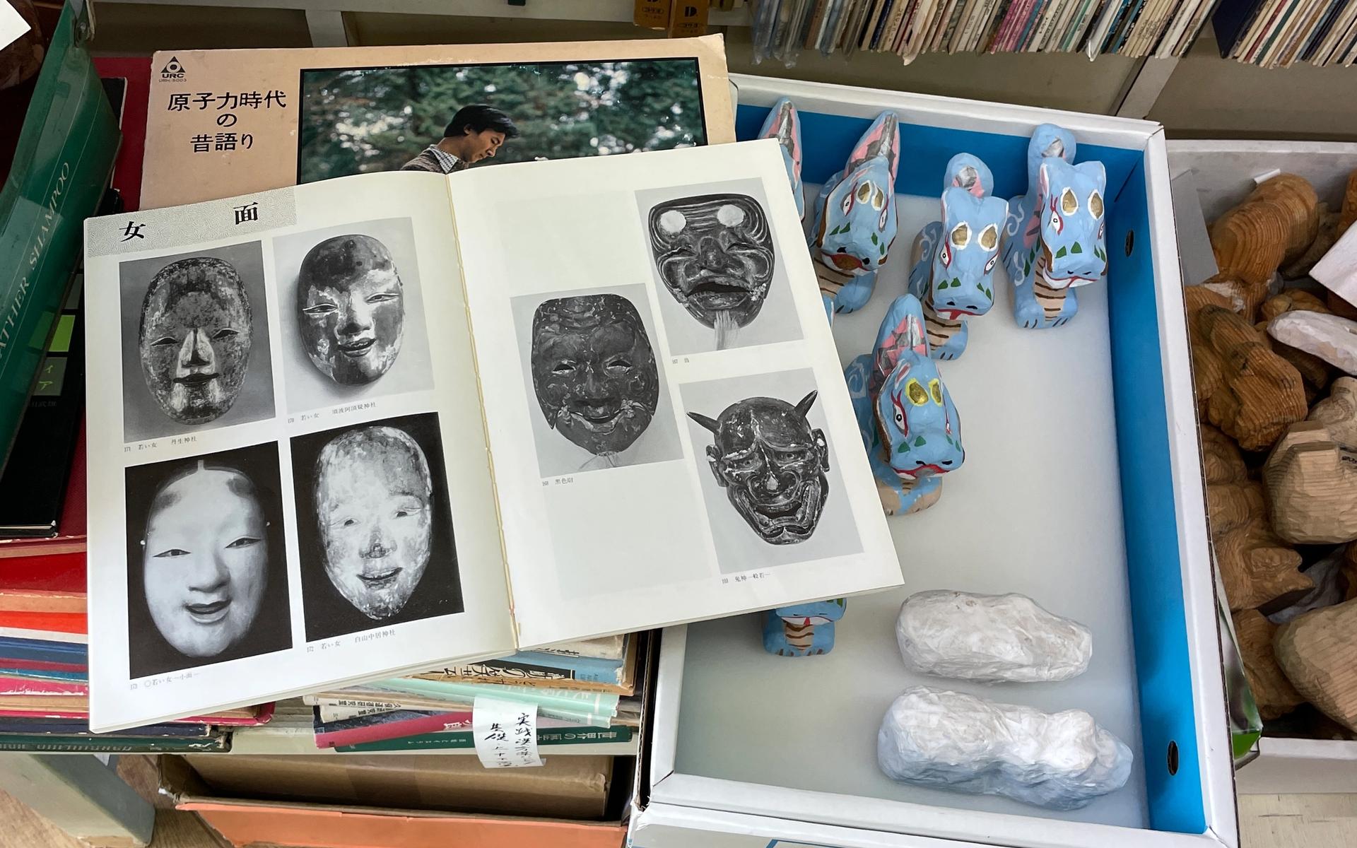 A book about traditional Japanese masks sitting on top of one of Fukukawa-san's records from when we was a folk musician.