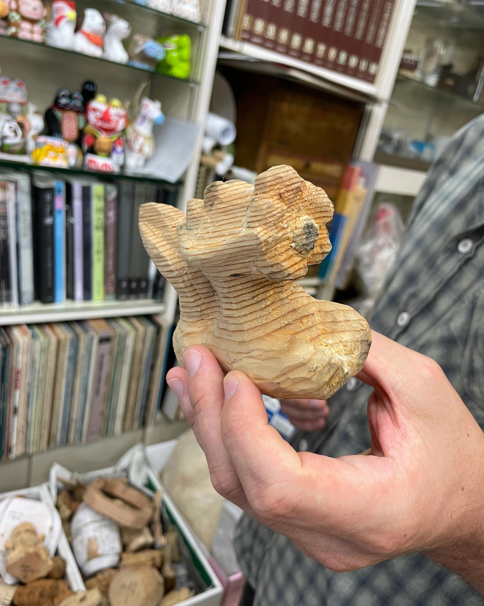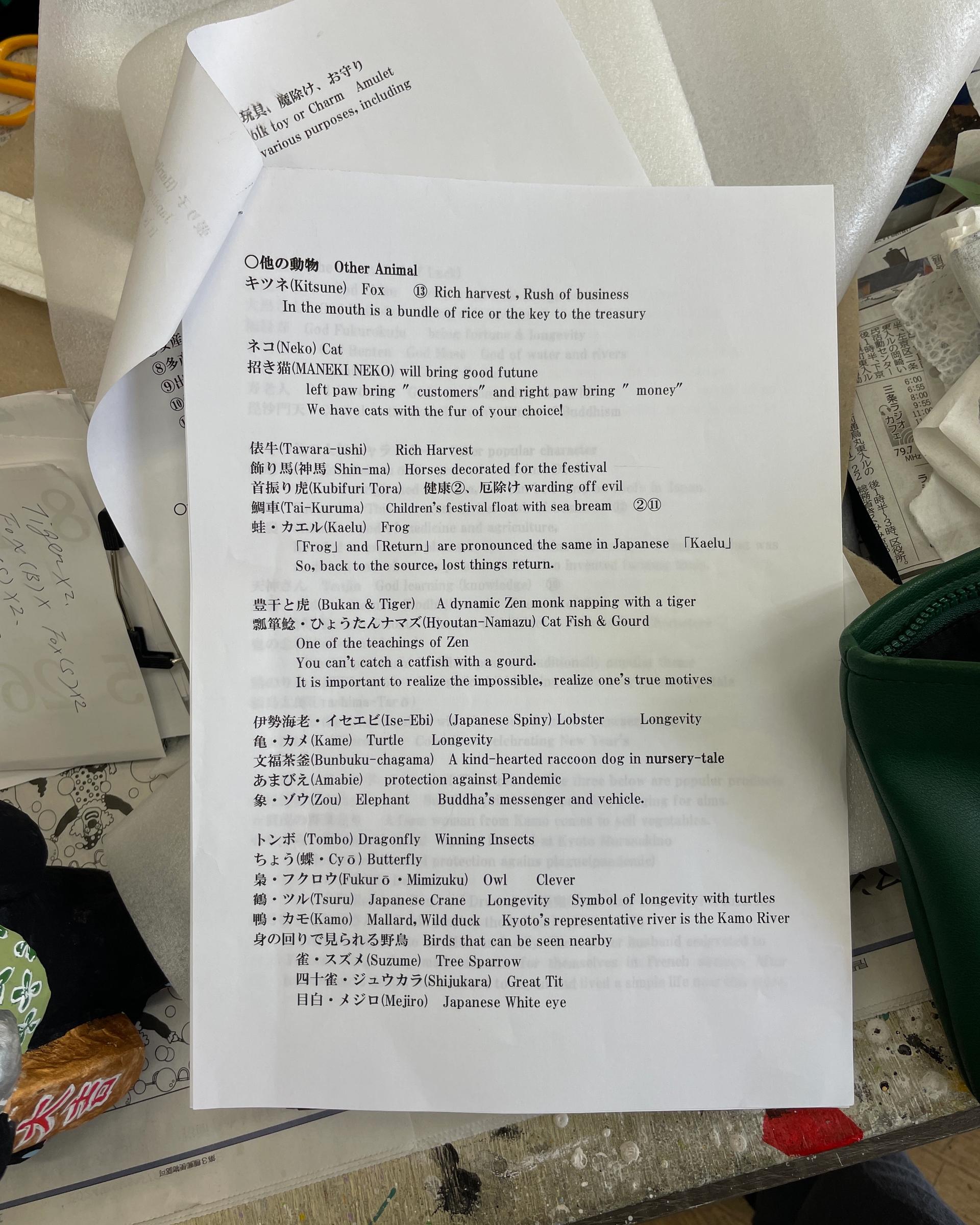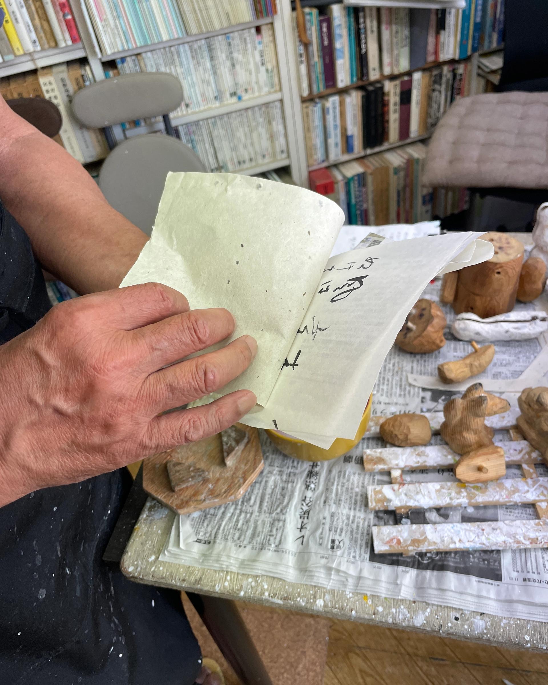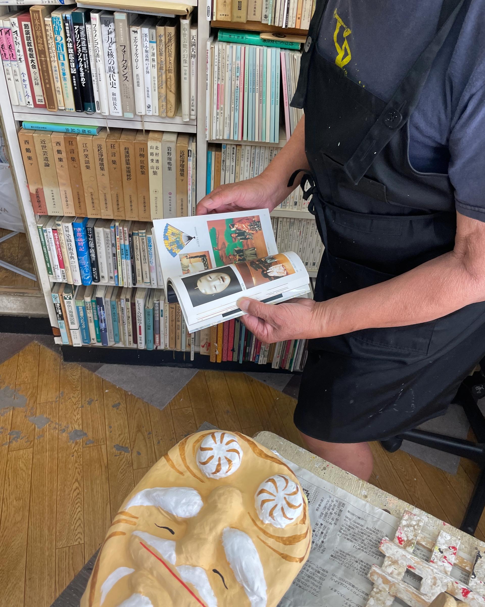 In the studio where Furukawa makes his hariko, it is filled with books and records. Sometimes he gets out books to explain the origins of certain works he has made.