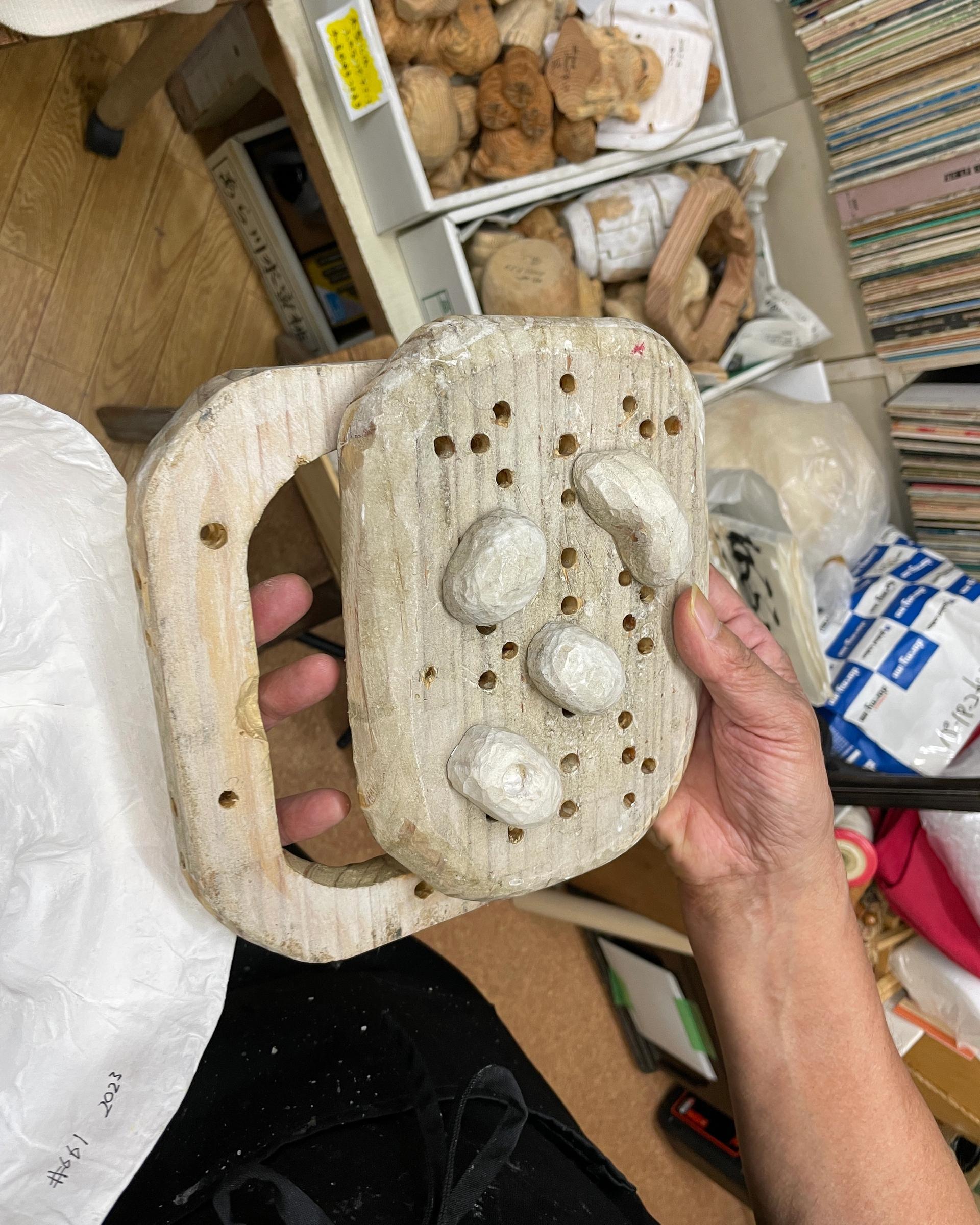 Above: on the left is the loose wooden cats arm and on the right shows some hariko just removed from the wooden moulds.
