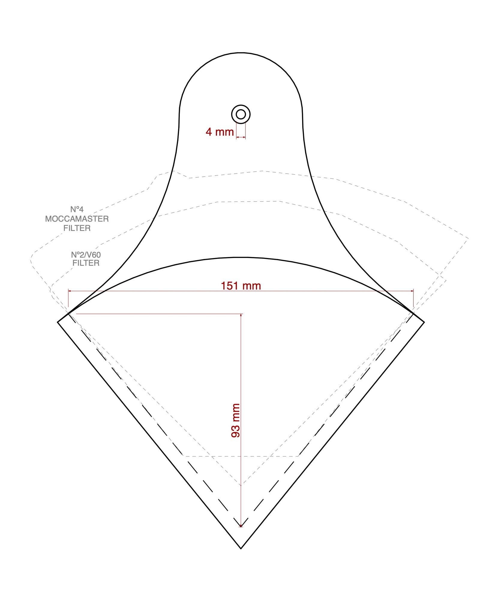 Mason carefully worked out the right angle to be able to hold both common filter types: No4 (which works for moccamaster and our vintage braun coffee filter machine) and hario V60 (#2 size).