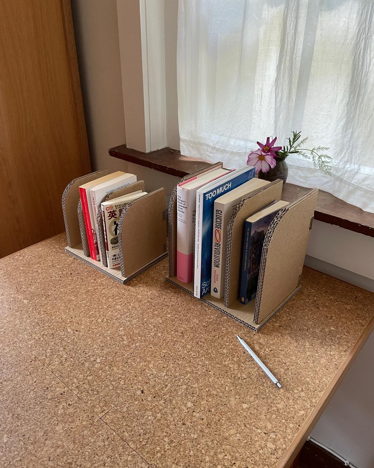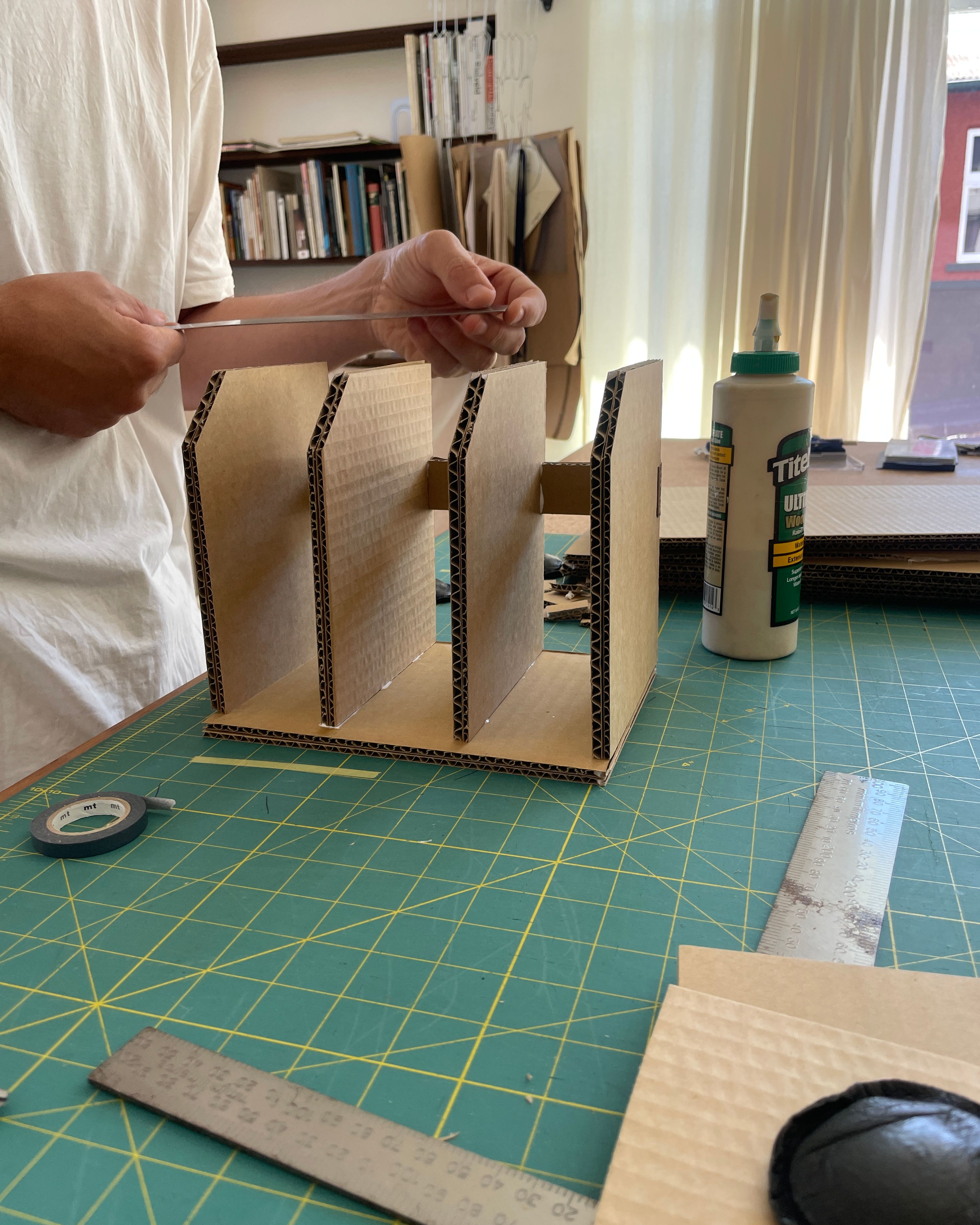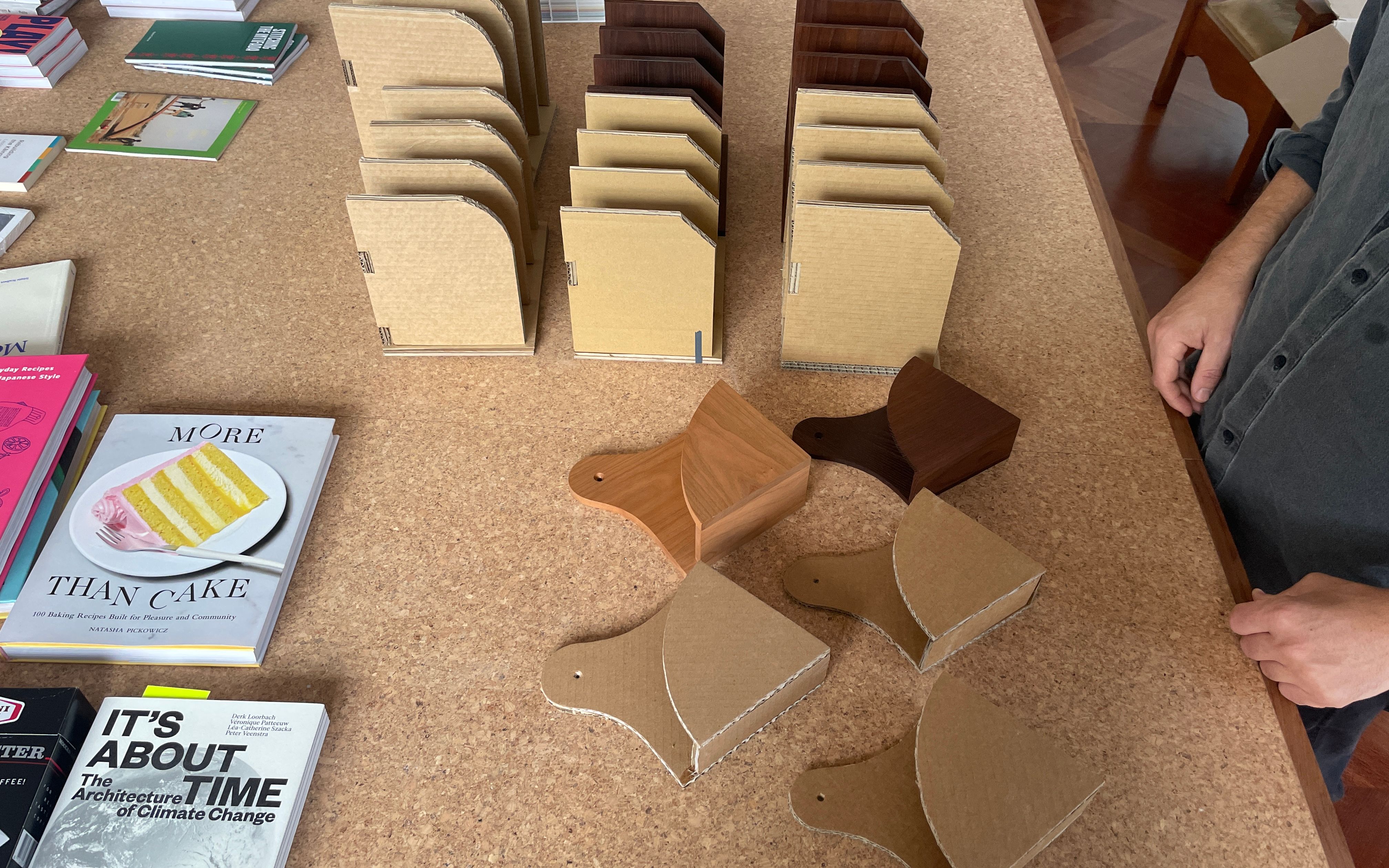 The bookracks are designed for people like us that love/ use/ reference and read books to organise those piles and clusters of books and magazines on desks, bed side table, dining table, coffee table or on a book shelves. As designers we have been finding these really useful to sort collections of books we are actively referencing for projects, or for piles of books we plan to read next, or books out from the library that we need to get through. This photo shows some of the earlier prototypes Mason made from cardboard, which we tested at home for months (and actually still use these cardboard versions too, as well as the wooden ones - they are so handy).