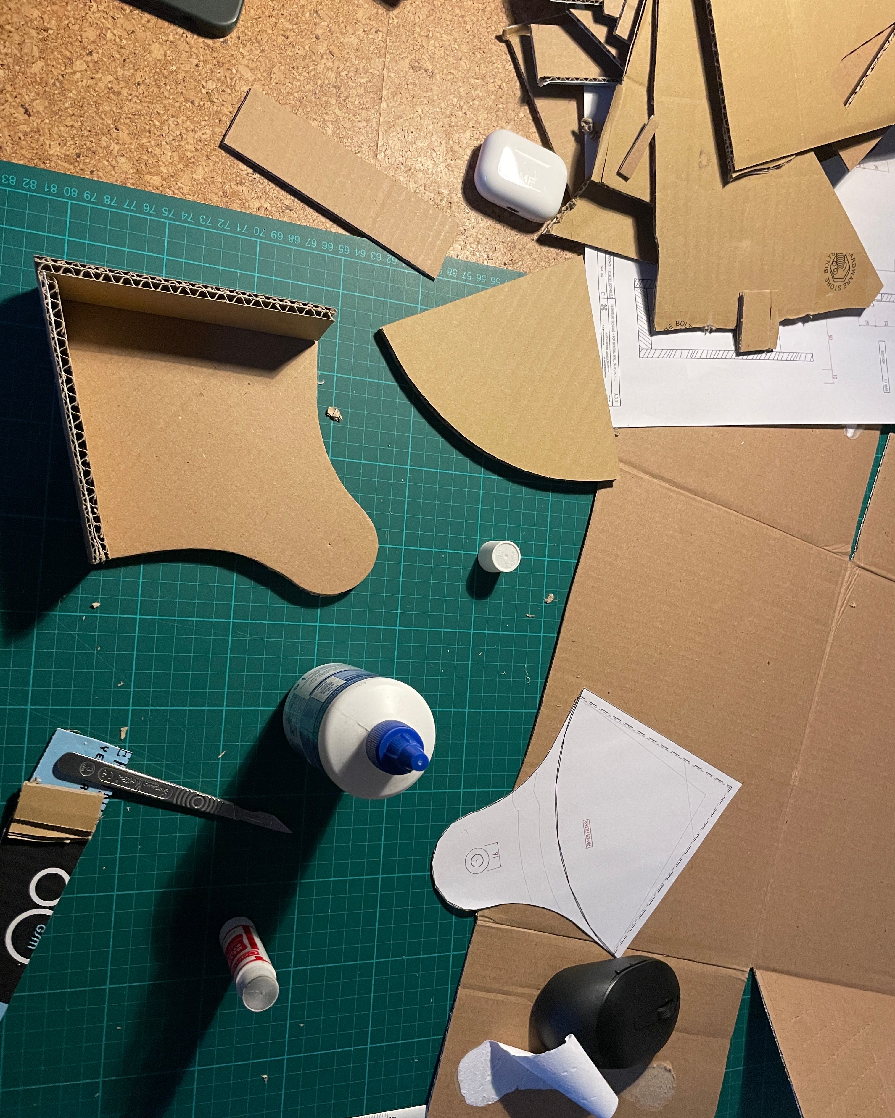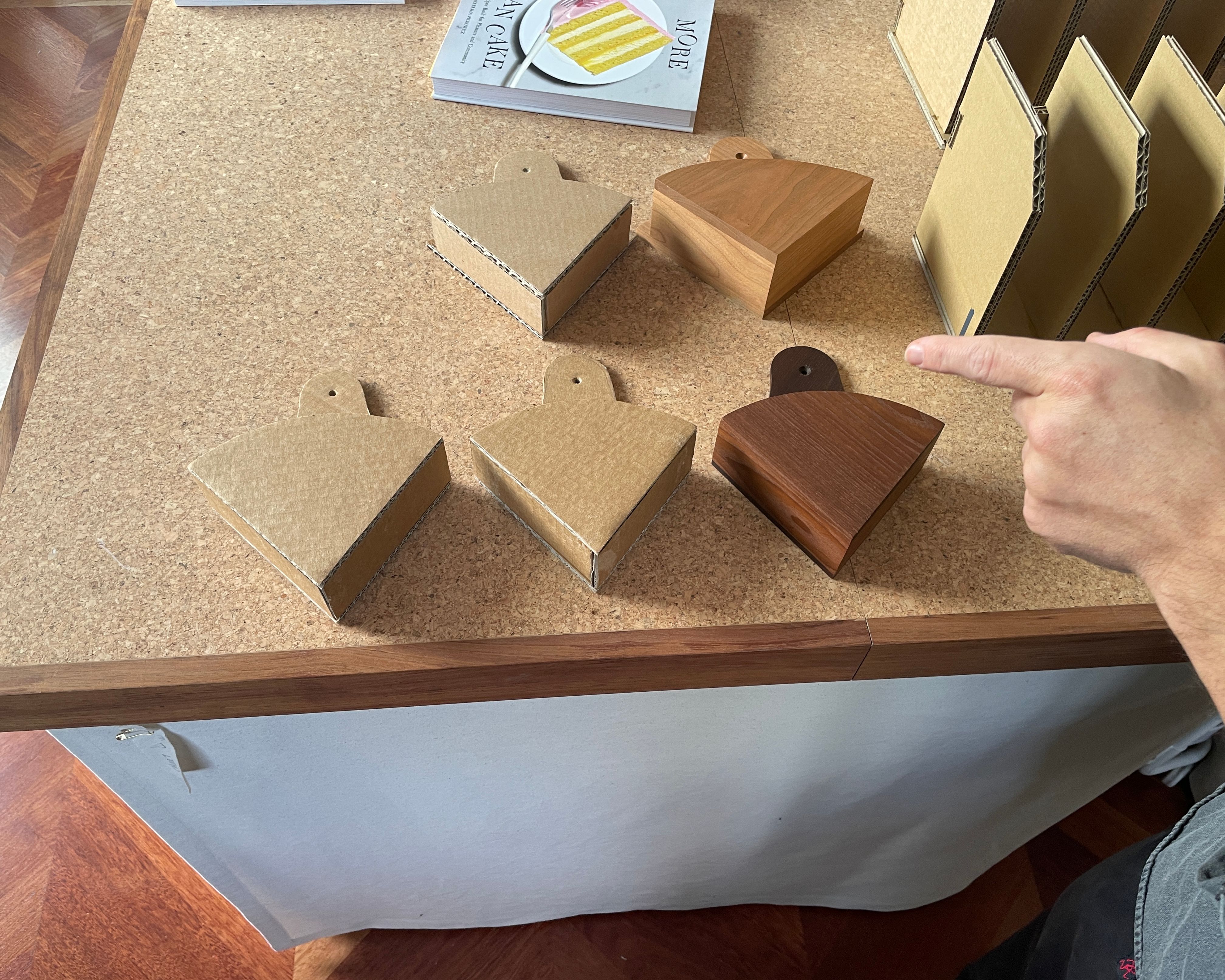 One of the cardboard prototypes we tested in our studio for a while to make sure it was good to use. This photo is a random one (the only photo I could find of one of the cardboard ones in use!) it is also showing Mason holding a little spice rack he repurposed from a scrap of wood from Emile's workshop bin from other projects :D