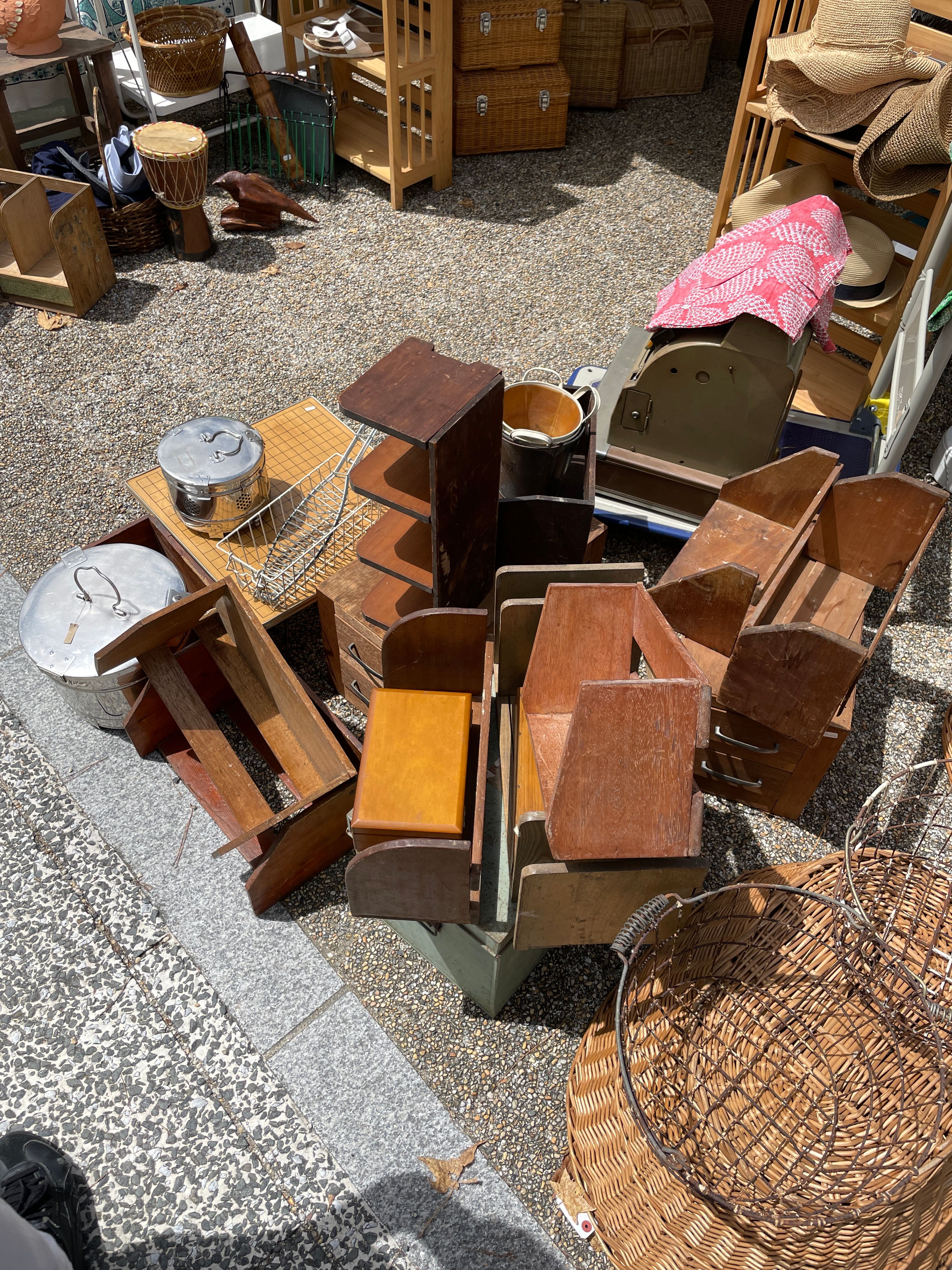 A pile of beautiful old wooden objects at an antique market in Kyoto, with a Japanese book rack sitting amongst it.