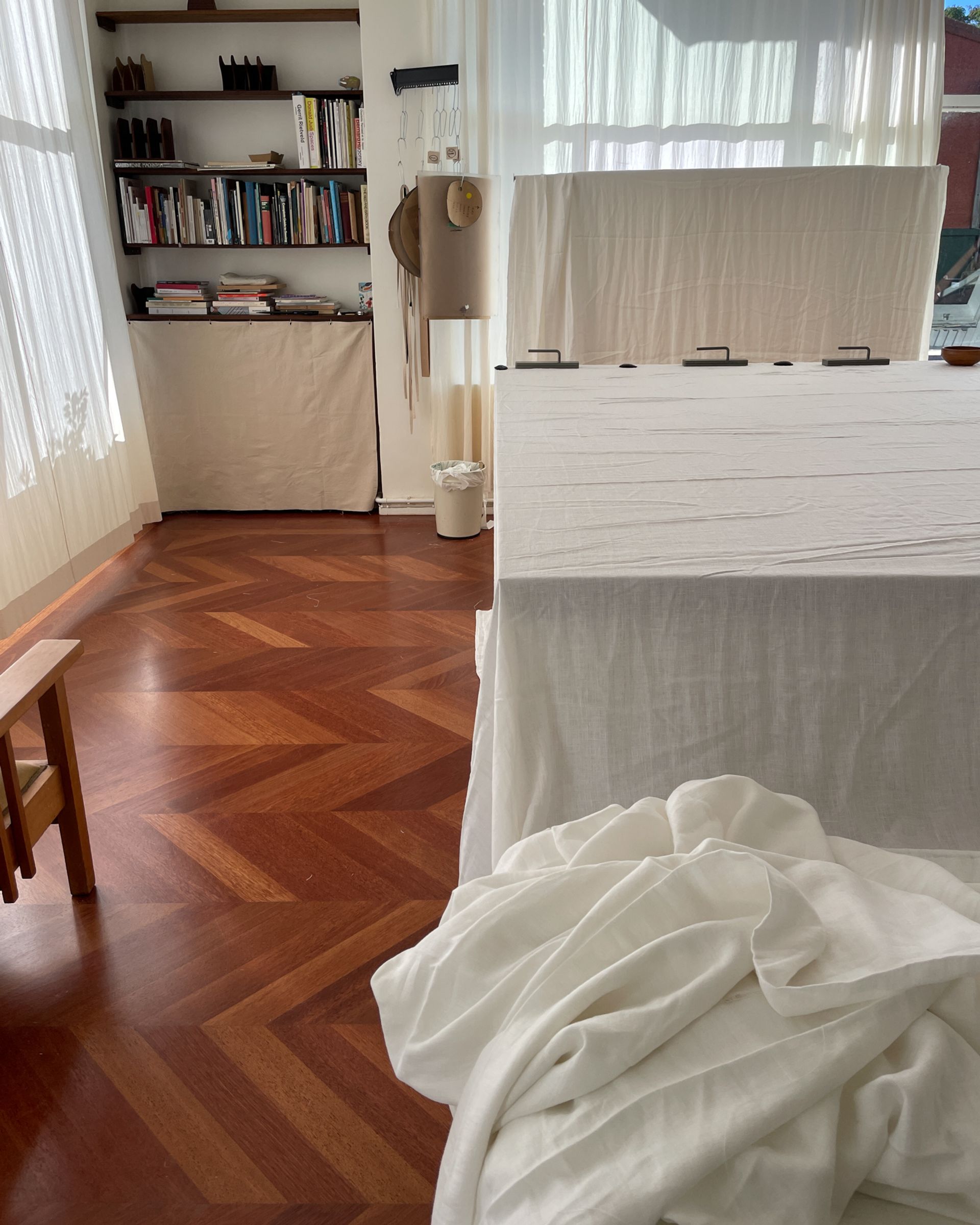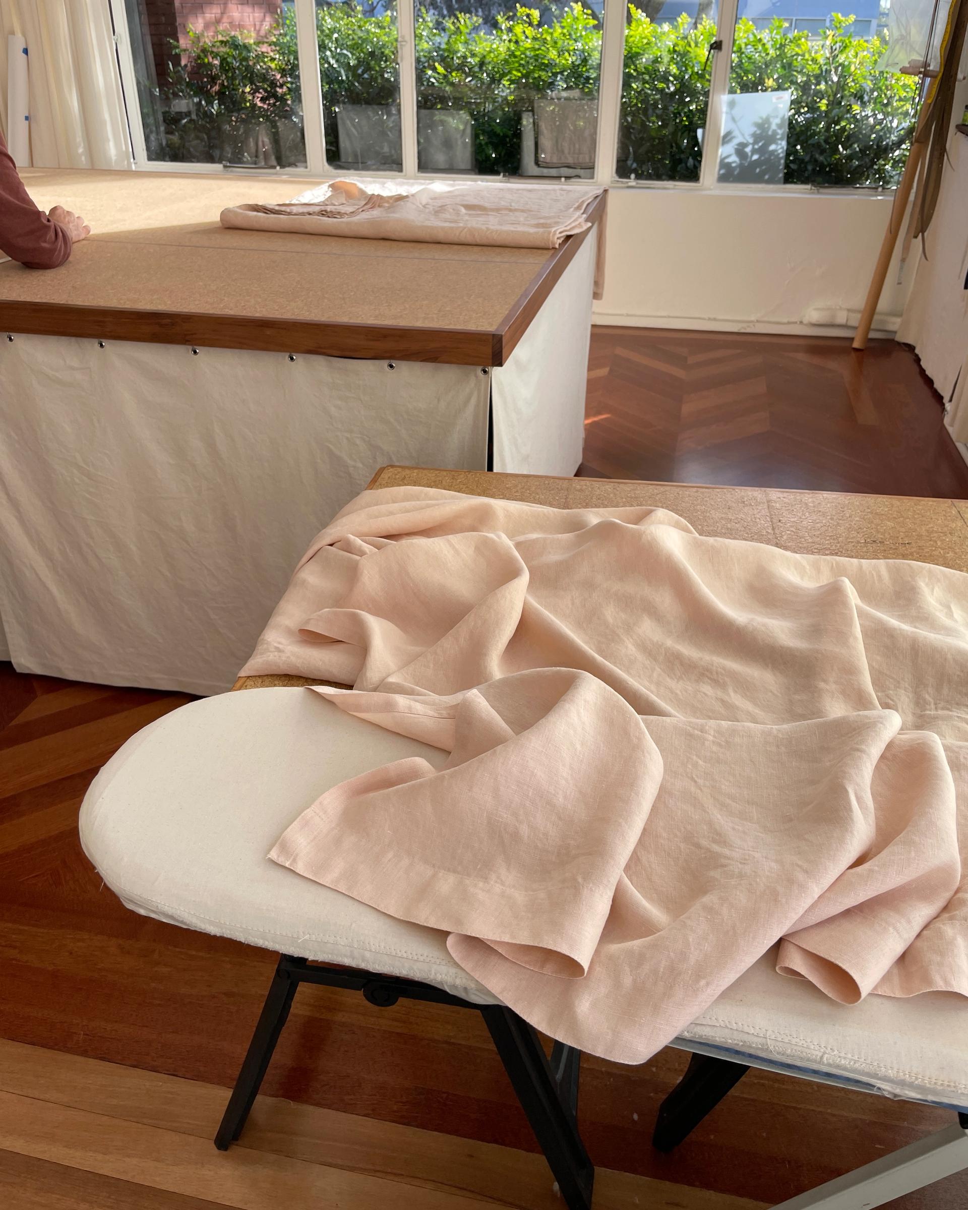 These are carefully handmade in our Auckland workshop. Because of their extra-wide size, each piece must be individually cut and sewn, making the process quite labour-intensive. As a result, we’re only able to produce one batch each year. Kirsty sews each one with great care, and we take extra steps to ensure they’re cut on grain so they hang neatly.