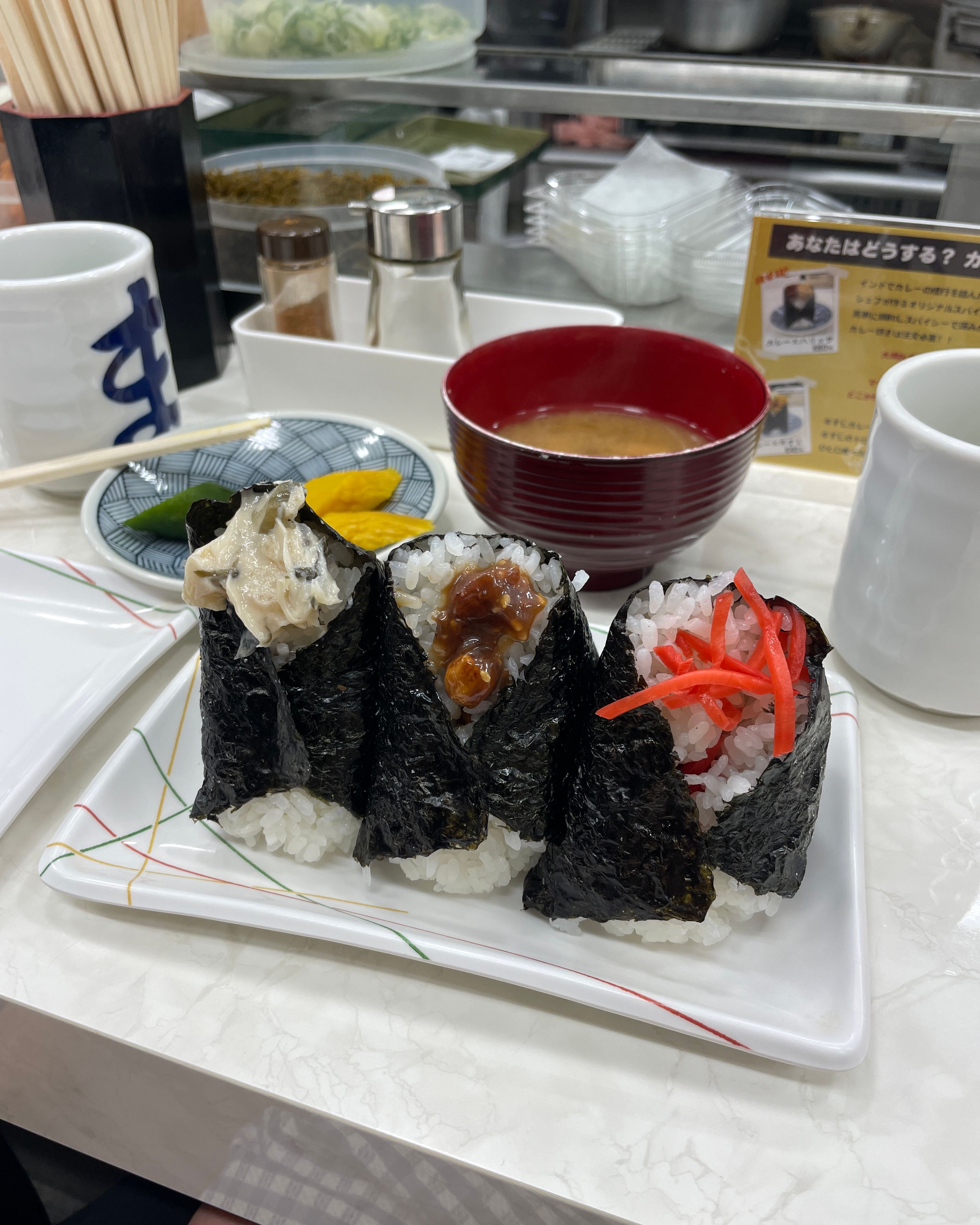 - Manma - Onigiri (lunch) This is a famous onigiri place. It was suggested by two Japanese friends. We waited in line for about 20 minutes. Shinjuku is touristy, so there were some tourists (as well as locals) in the line too. I got a bit flustered and overwhelmed when it came time to order & wish I had studied the menu better/ understood about how to combine flavours, but it was still great & I liked the side of pickles & soup too.