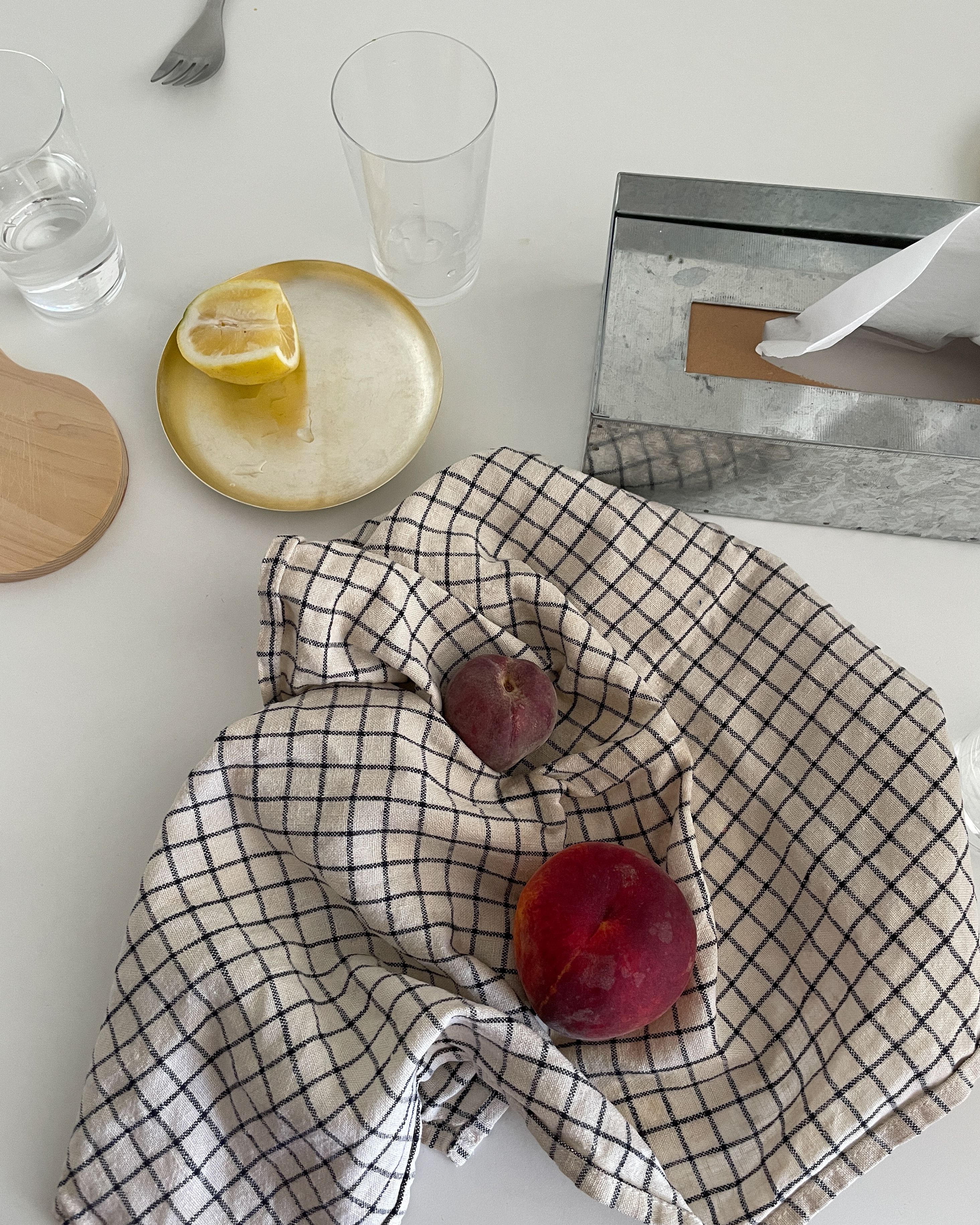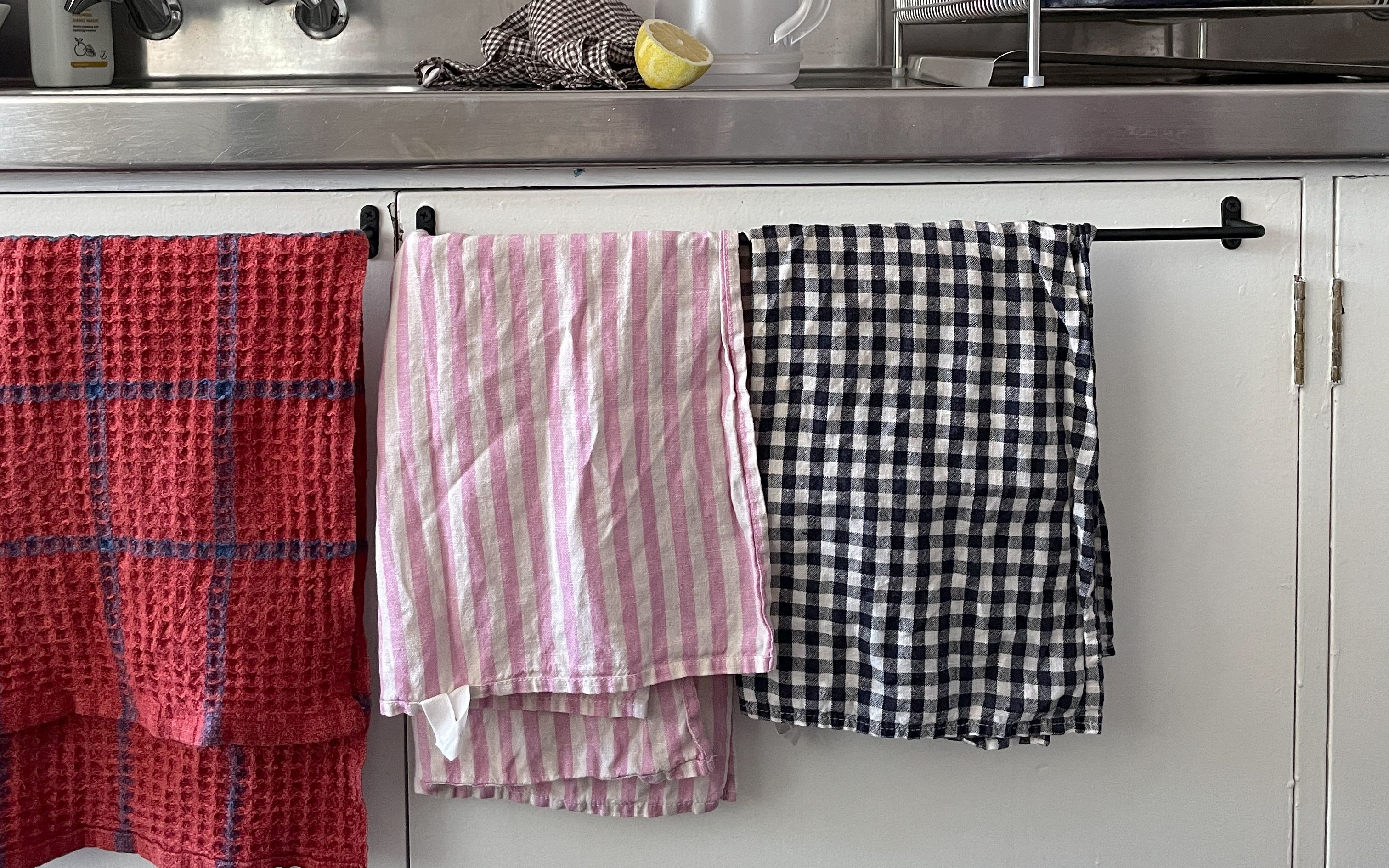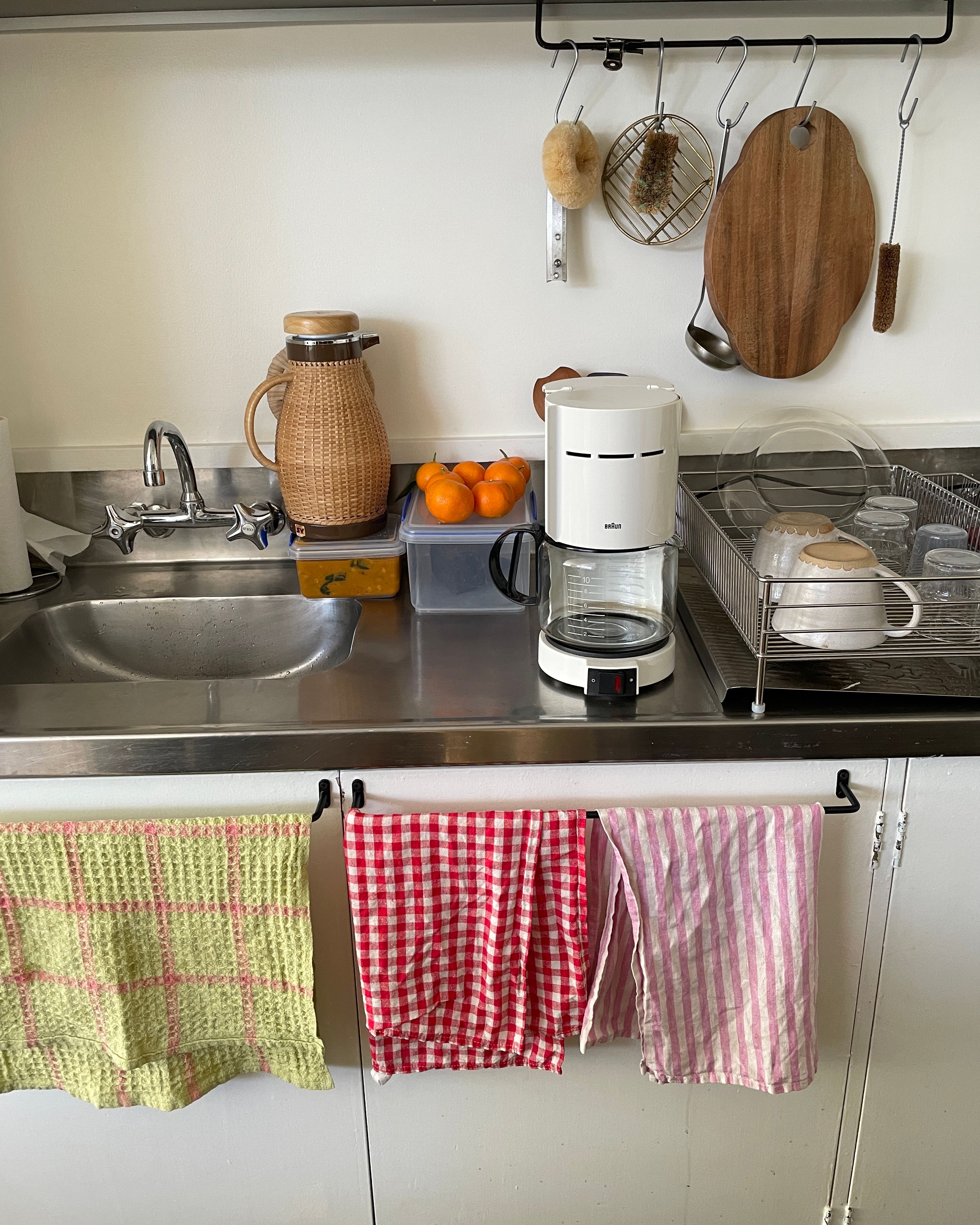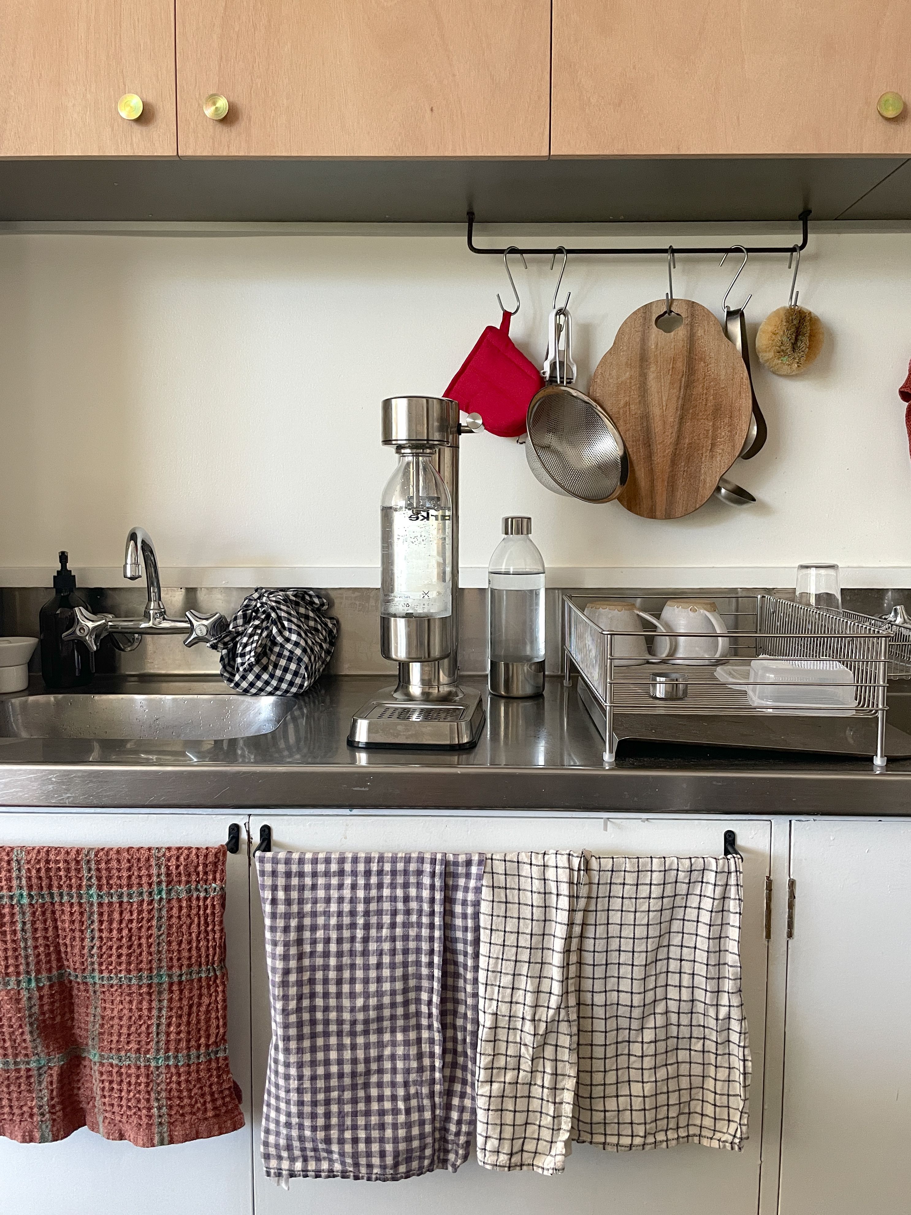 We have a stock pile we have been collecting over the years of the linen tea towels from Japanese brand Fog Linen. The tea towels are very, very good. They are absorbent, fast drying, get more floppy/ soft as they used... and so pretty in our little scrappy kitchen. We have several colours to choose from here. We also keep a little linen oven mitten handy in our kitchen. We also sell the Iron Rails that they are sitting on, which we also use as a door handle in this situation! The S hooks hanging from the Iron Rail above are from Frances Nation Shop, although these S hooks are a common size/ shape, I have found the ones at Frances Nation have a much nicer finish and tone than others around. The hand towel to the left is from our friend Harry Were's shop.