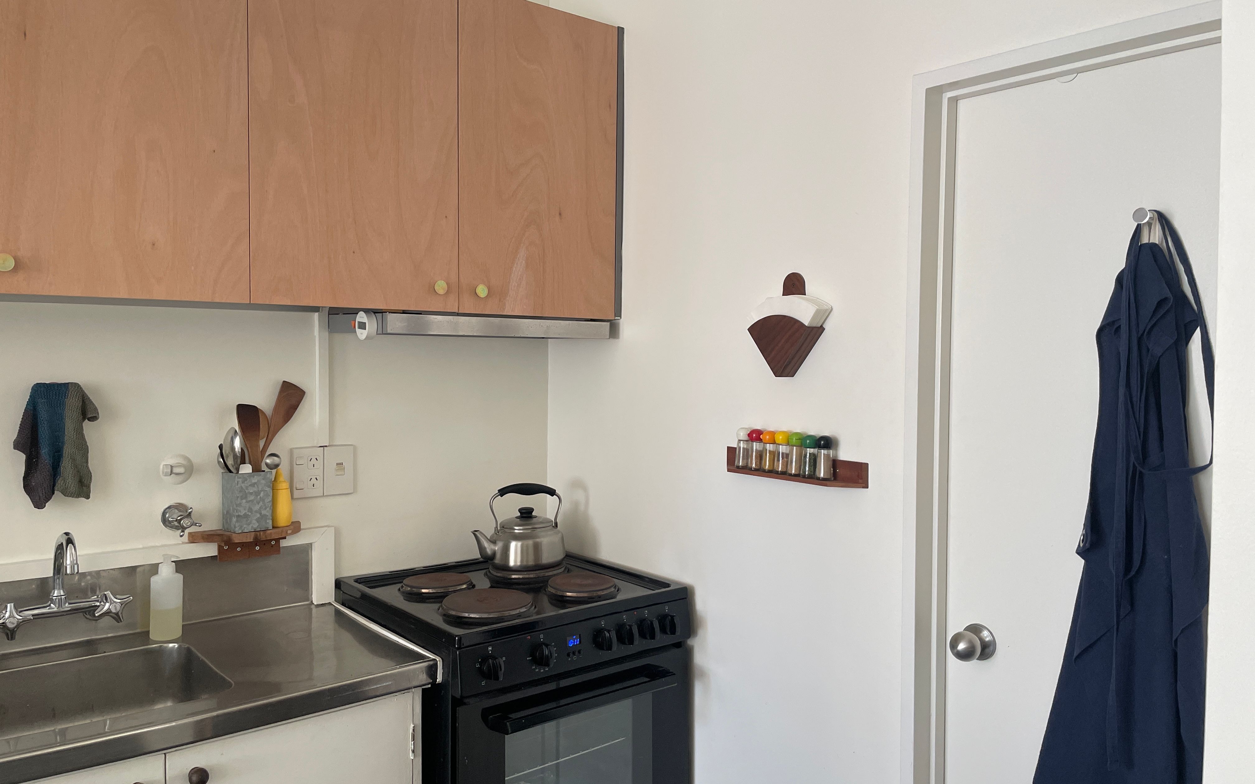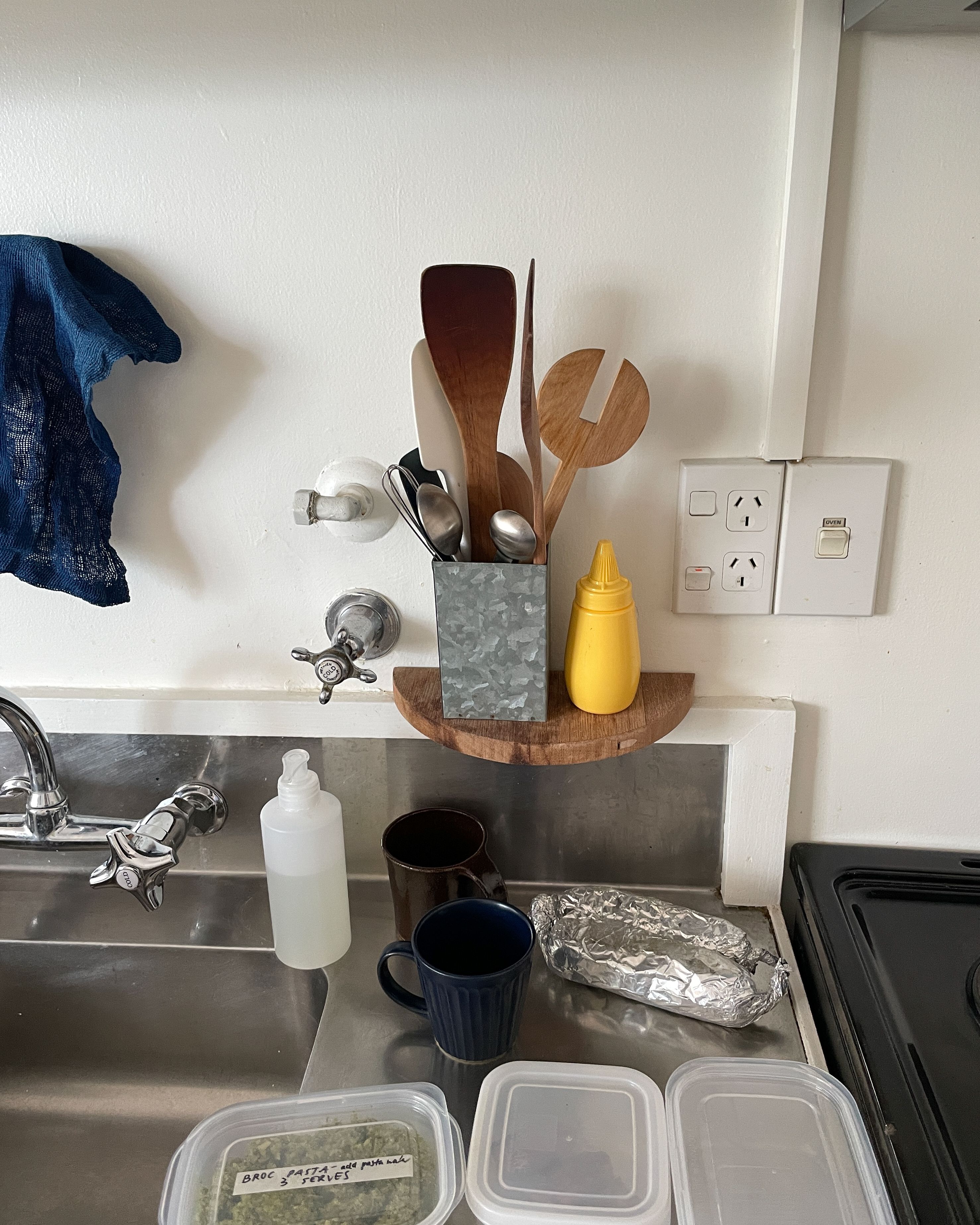 They are sitting on a little wooden off-cut, that Mason salvaged from Emile's offcuts pile, that Mason turned into a perfect little shelf for the spice jars to live on.