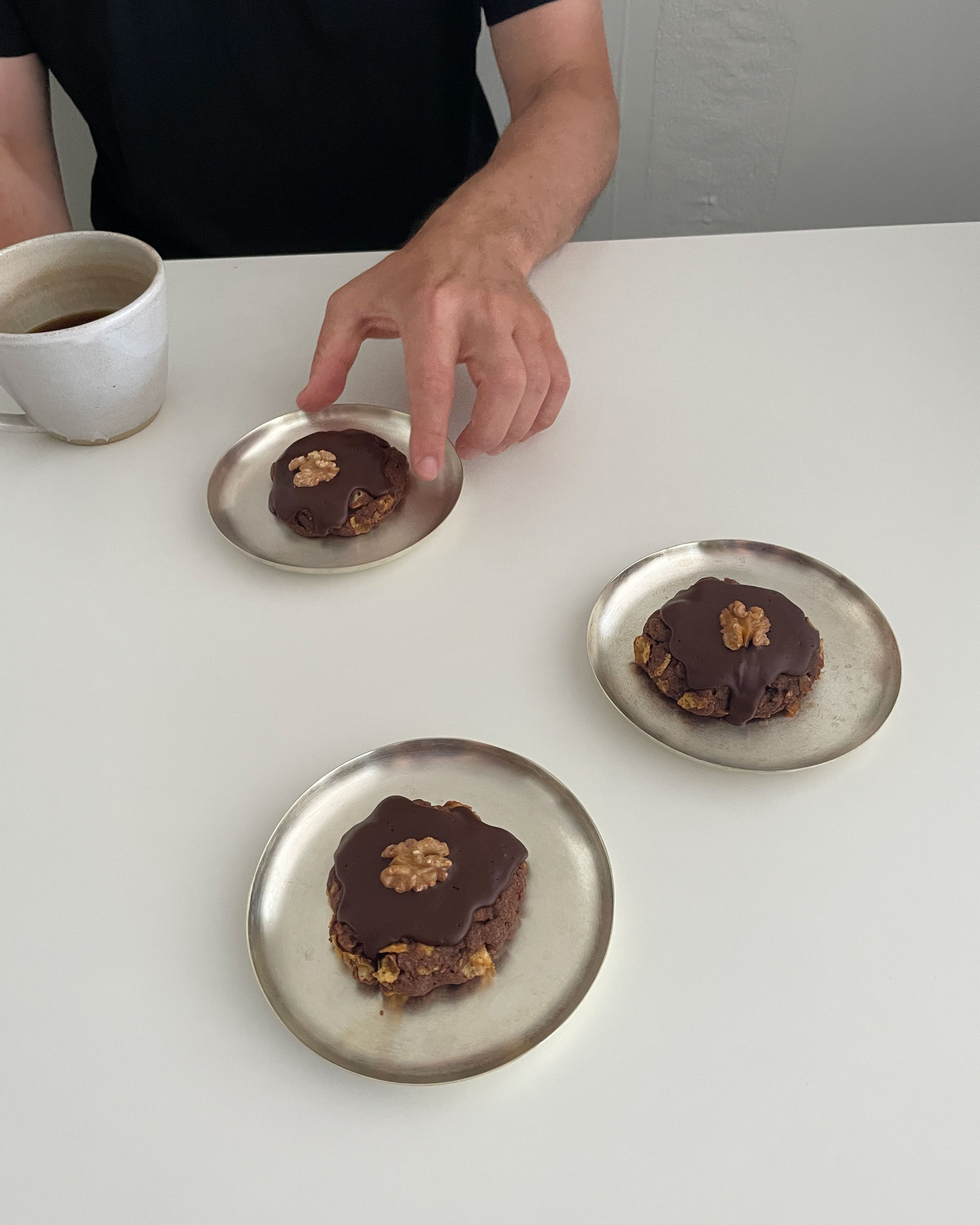 We eat together everyday in our studio kitchen. Usually leftovers/ batch made meals from the freezer. A couple times a week we have sweet treats too. For snacks like cookies, cakes, fruit or toast, we use our pretty little silver plates by Fog Linen. Pictured here with the beautiful xmas cake from our favourite bakery Florets.