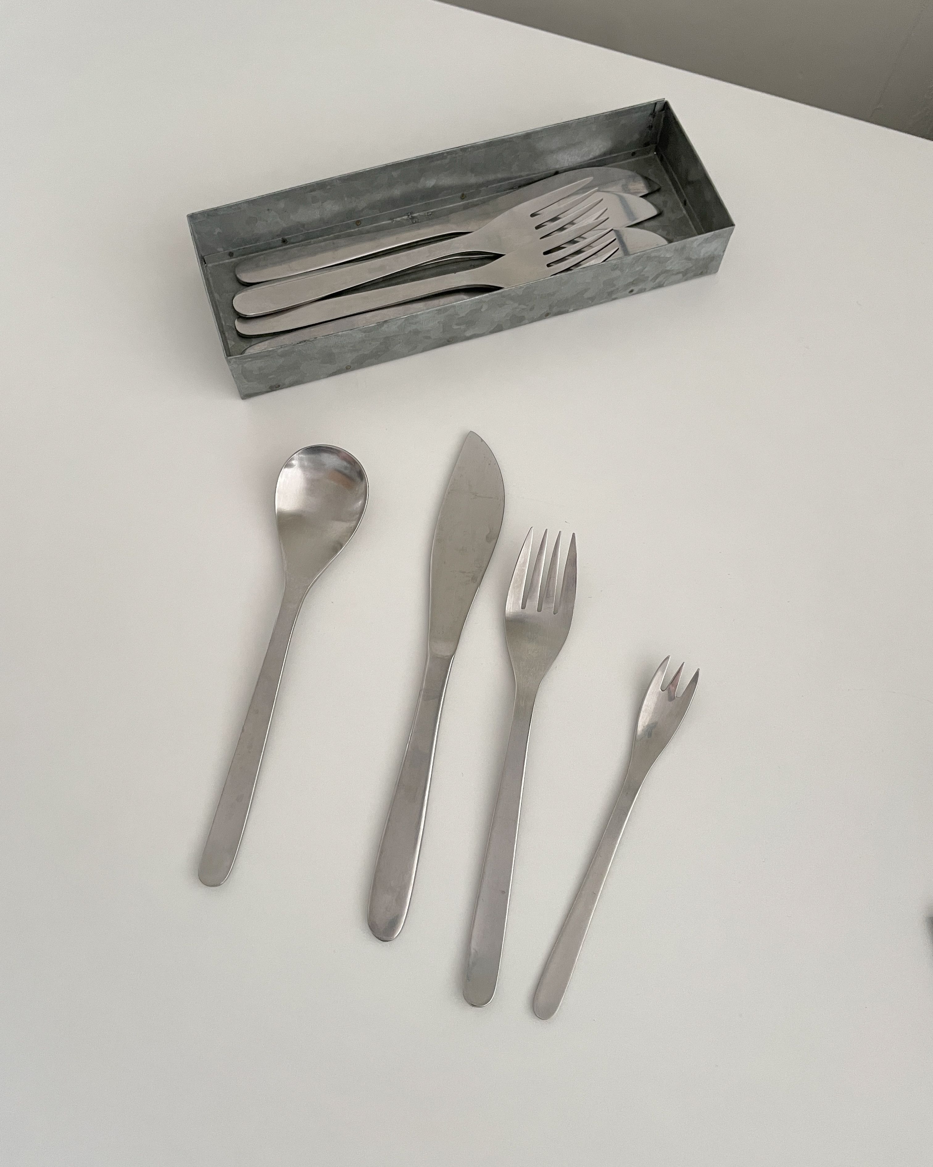 We have four options of the storage box/ trays by Fog Linen made from Galvanised Steel that we sell & we use all of them! There is the Utensil Stand, the Card Box, the Spice/ Cutlery Storage Box and the Tissue Box.
