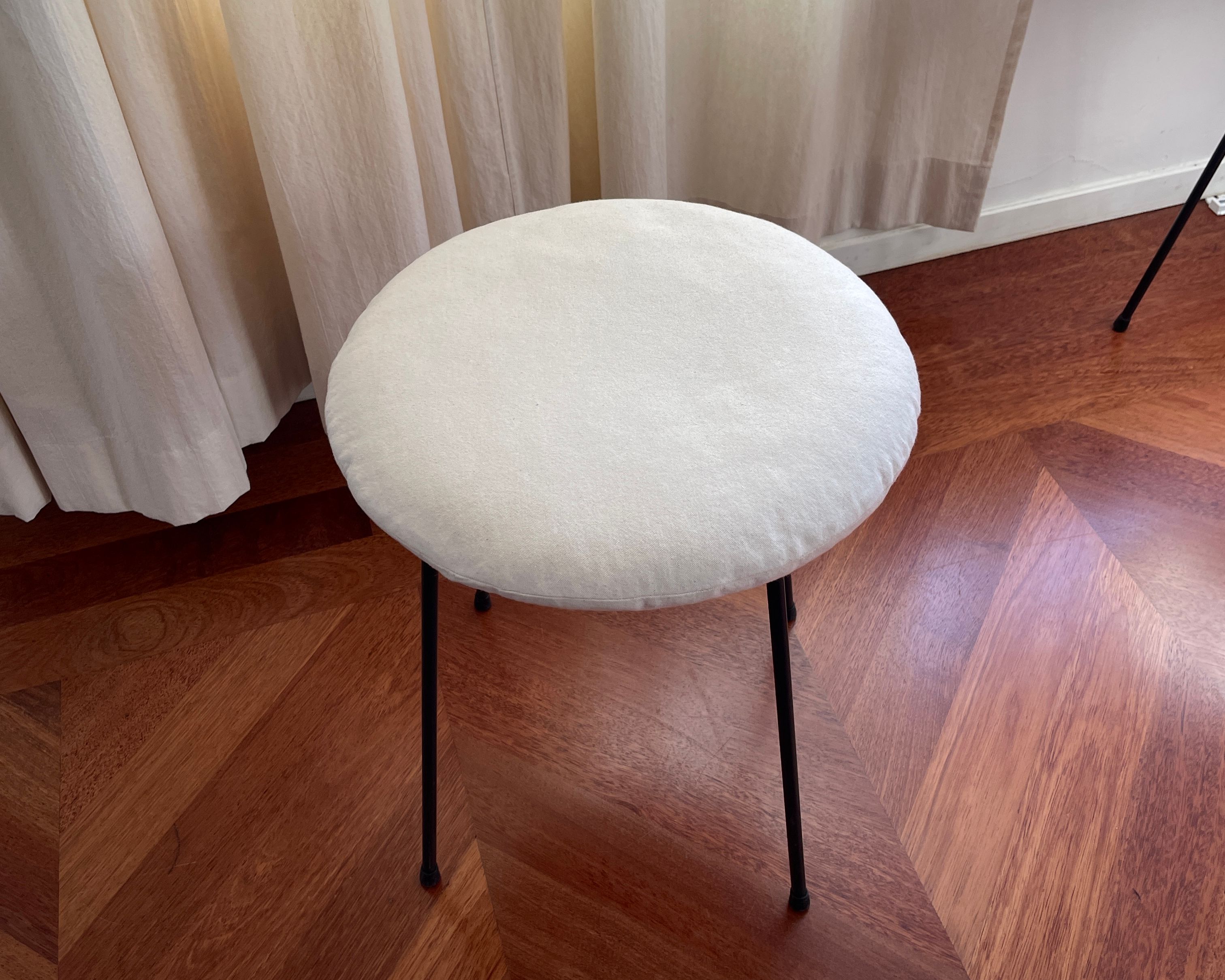 This is a Natural Canvas Disc Squab cushion that we have been using everyday in our workshop for about 3-4 years. We use it on top of stools in our kitchen to make them more comfy. I love how it's flattened and become even more disc shaped over the years from being sat on so much.
