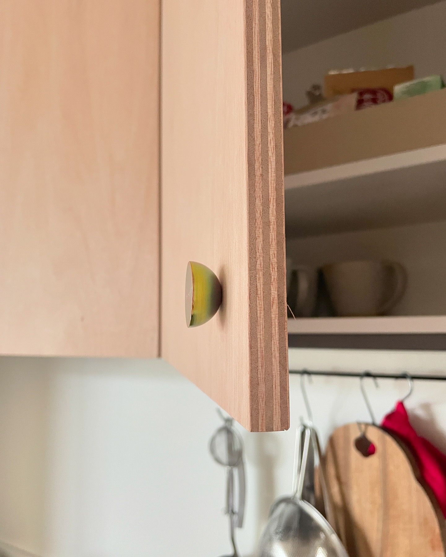 When we first moved into our workshop we removed the grey plastic cupboard doors that were in the kitchen. They were scrappy open shelves (not in a nice way) for a long time before we finally got some ply cut to replace them. We had fun shopping from our own shop choosing the door knobs/ handles that we sell to go on them and in the end went with the Iridescent Gold Dome Knobs, which Kirsty said it was like picking buttons and that it was like jewellery for the kitchen <3.