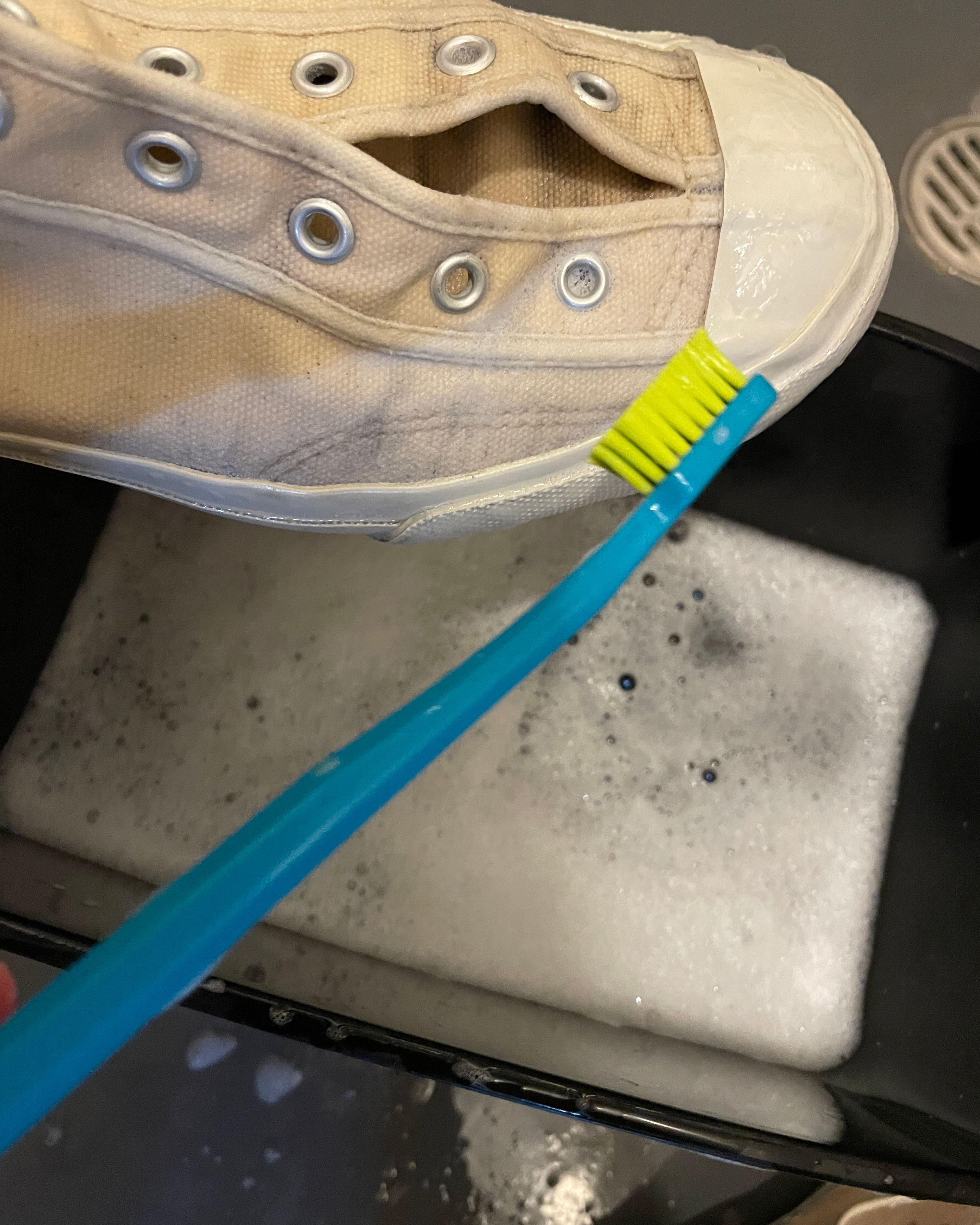 - To wash: Clean off any bigger pieces of dirt with a damp cloth then fill a bucket with warm water and mild eco laundry liquid and put the shoes (with laces removed) into soak for 15-20 minutes. Then scrub with an old toothbrush or nail brush, something gentle. To dry: Never put in a dryer. Ideally dry in a shady windy spot, or just not in direct sun for too long.
